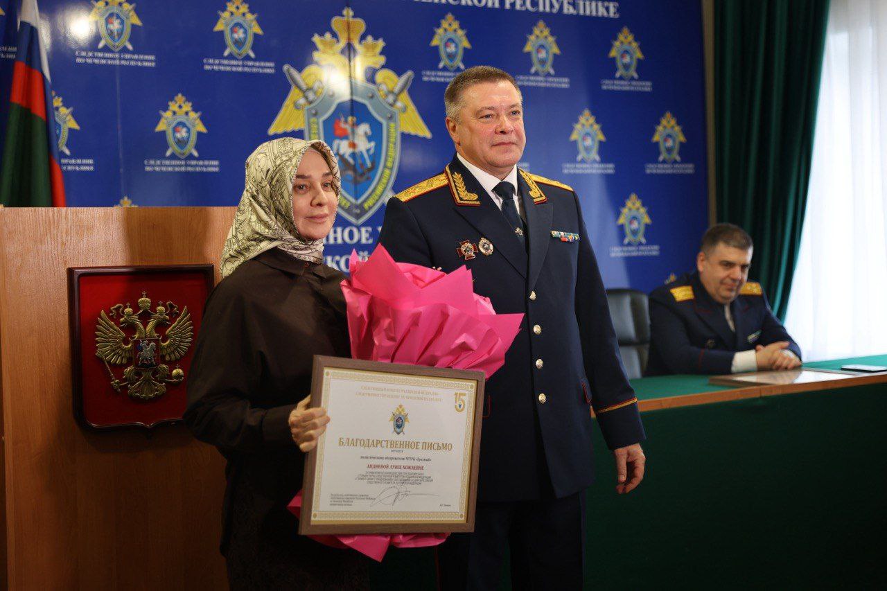 В ходе торжественного собрания руководитель следственного управление СК России по Чеченской Республике генерал-майор юстиции Андрей Евгеньевич Потапов отметил благодарственными письмами за эффективное взаимодействие с ведомством директора ЧГТРК «Грозный» Чингиза Ахмадова и политического обозревателя ЧГТРК «Грозный» Луизу Андиеву.