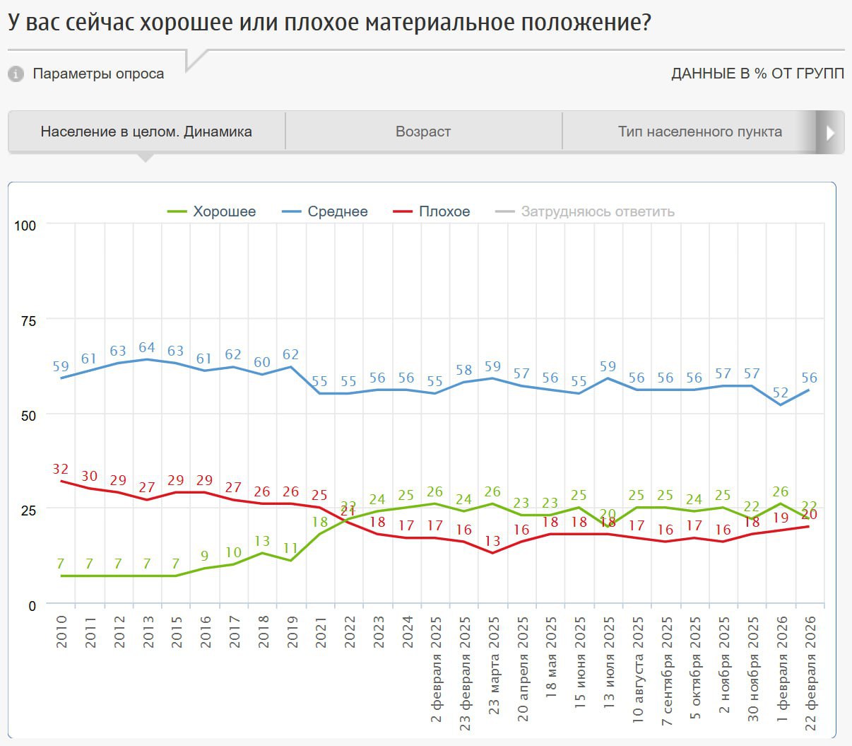 Согласно последнему опросу ФОМ, материальное положение россиян показывает признаки улучшения: каждый пятый (22%) оценивает свое финансовое состояние как хорошее, а 56% — как среднее. При этом 9% граждан отметили улучшение за последние месяцы.