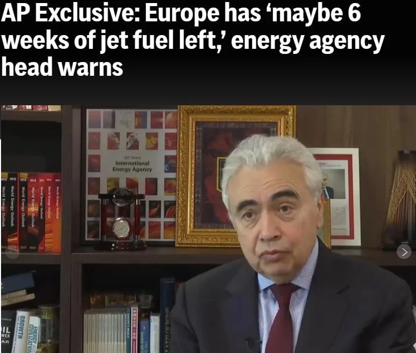 Авиатоплива в Европе осталось на 6 недель, — глава Международного энергетического агентства Бироль в интервью АР.