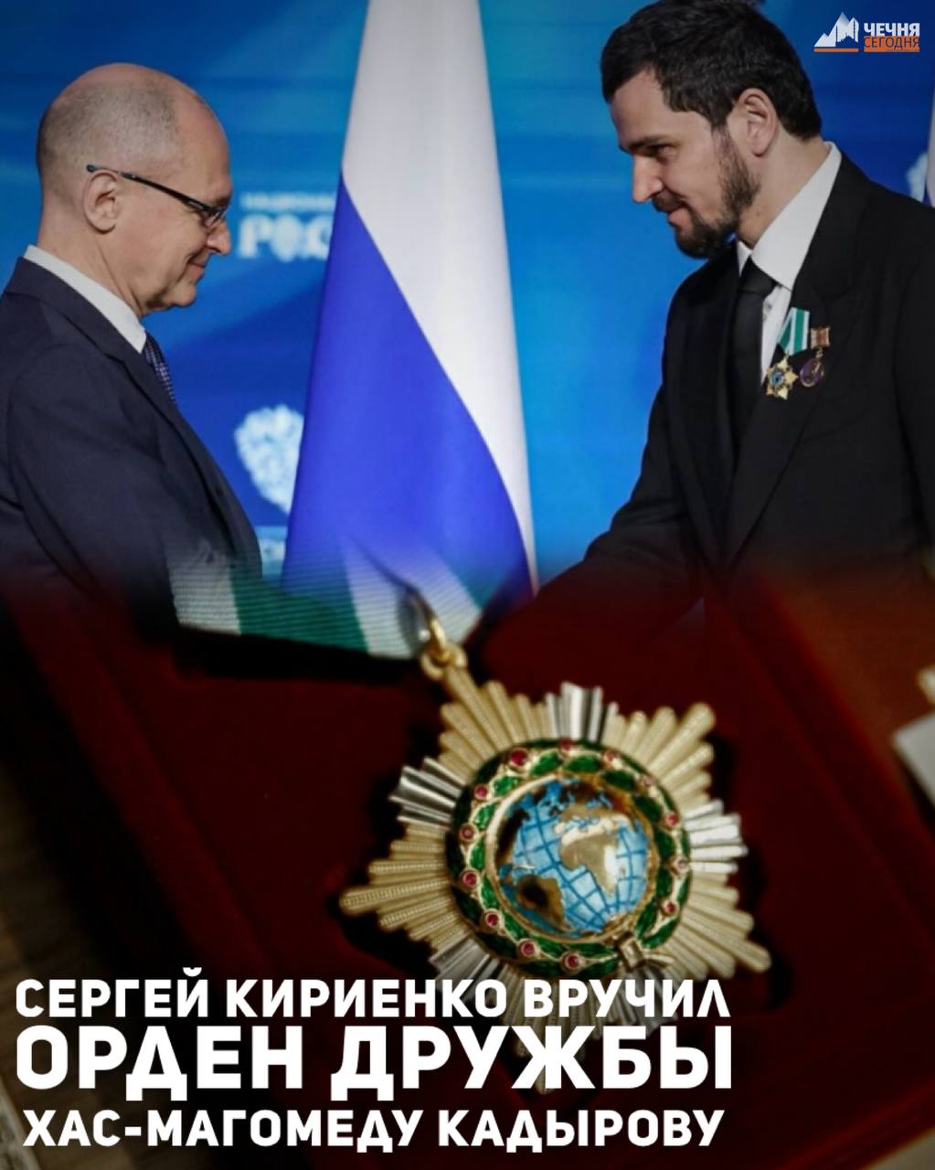Первый заместитель руководителя администрации президента РФ Сергей Кириенко вручил орден Дружбы мэру Грозного Хас-Магомеду Кадырову в рамках церемонии открытия II Всероссийского муниципального форума «Малая Родина — сила России».