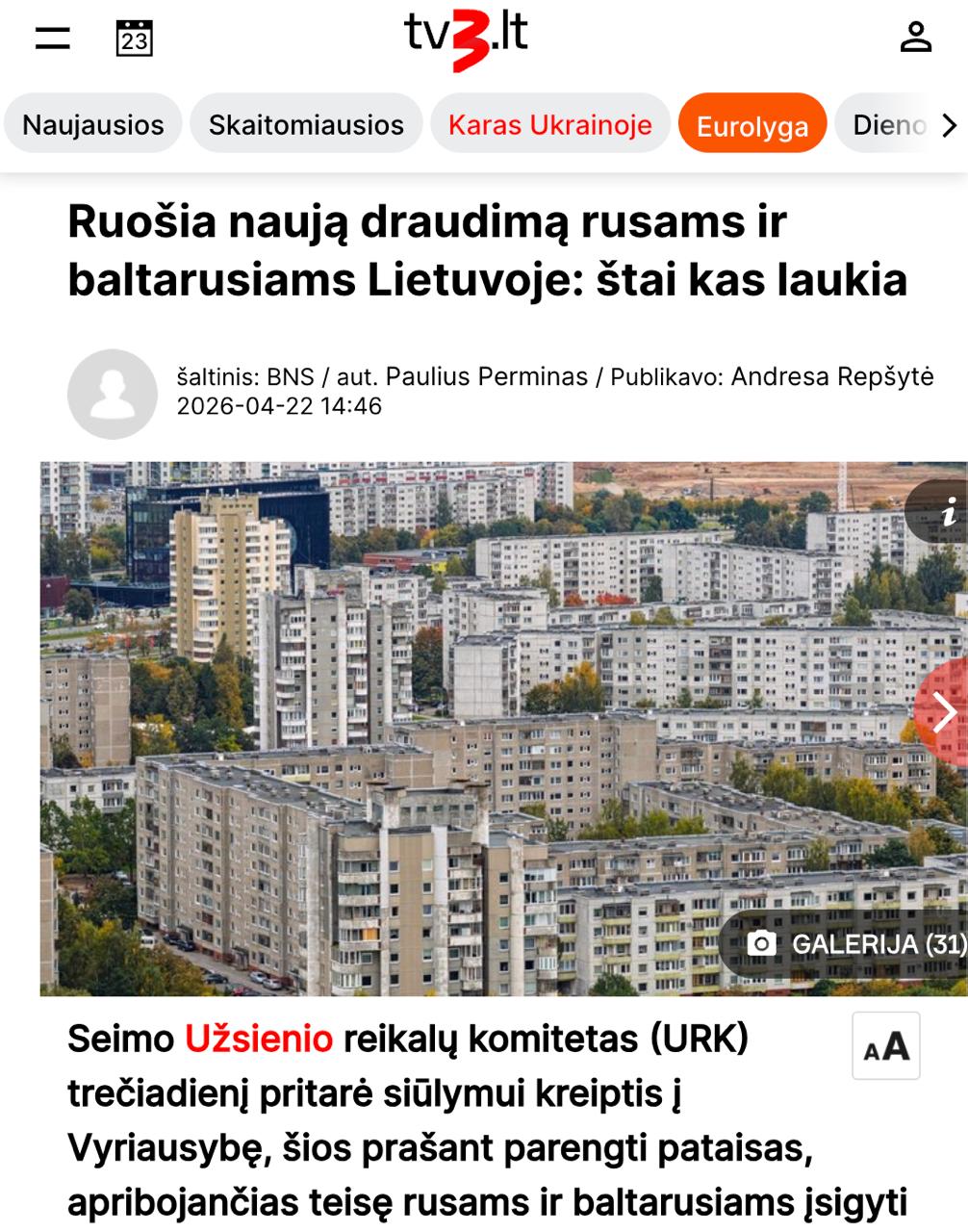 В Литве одобрили запрет на покупку недвижимости для россиян и белорусов.