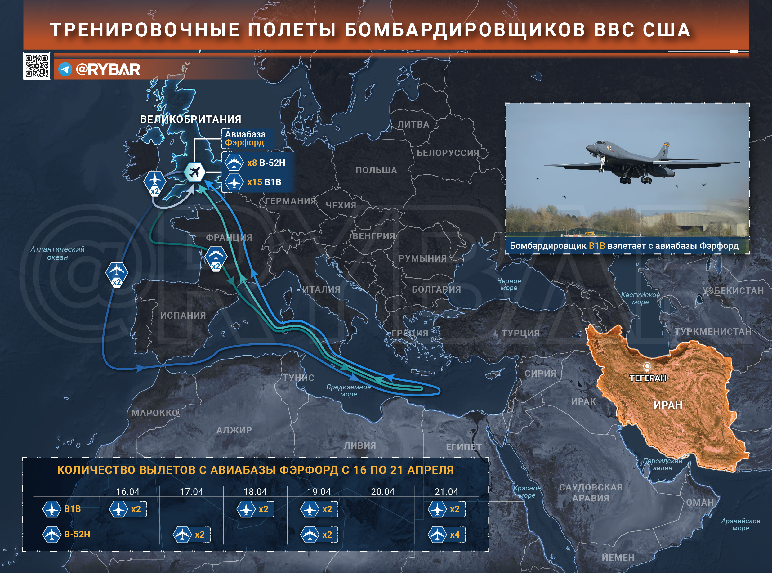 С 16 апреля было проведено не менее 7 учебно-тренировочных полетов В-52Н и В-1В, которые осуществляли полеты в Средиземное море, над Европой, а также в Атлантический океан, отрабатывая разные маршруты выхода на удар по Ирану.