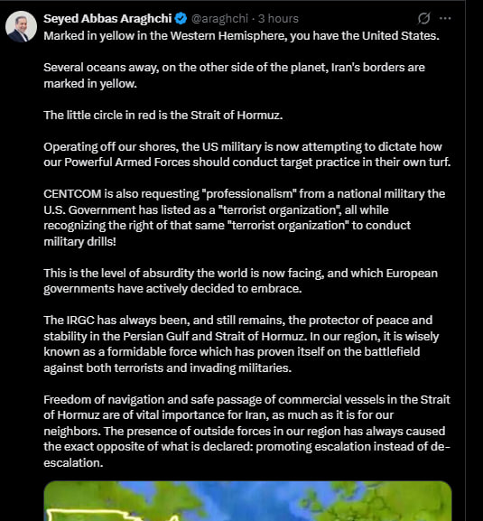 Свобода судоходства и безопасный проход коммерческих судов в Ормузском проливе имеют жизненно важное значение для Ирана, как и для наших соседей. Присутствие внешних сил в нашем регионе всегда приводило к прямо противоположному заявлению: продвижению эскалации вместо деэскалации,