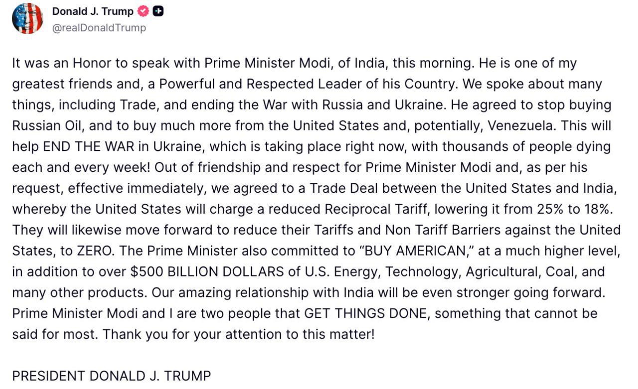 Трамп заявил, что премьер-министр Индии согласился прекратить закупки российской нефти.