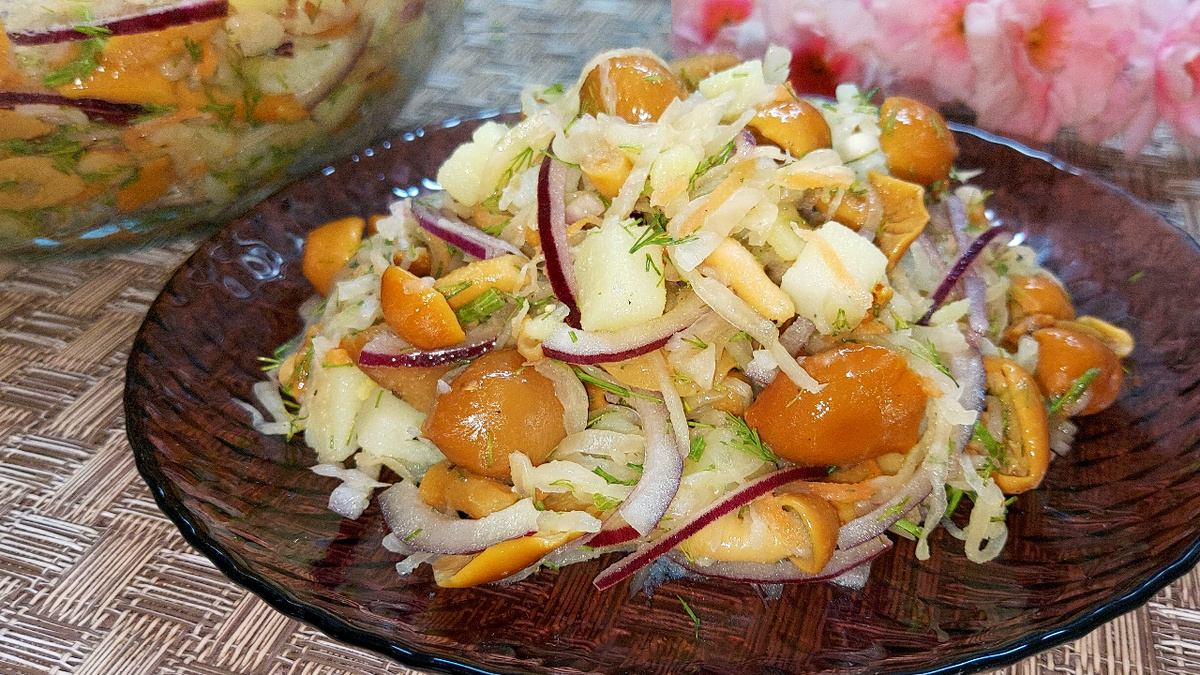 В большой миске объедините картошку, грибы, квашеную капусту, лук и укроп.