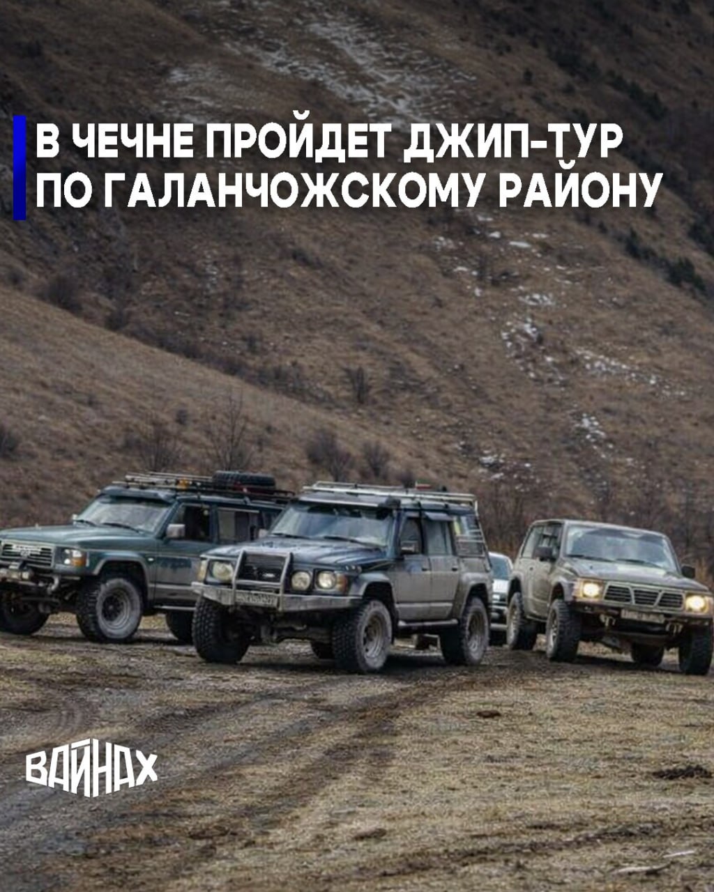 Уточняется, что джип-тур пройдет в рамках объявленного «Года горных районов Чеченской Республики». Маршрут тура пройдёт через населённый пункт Рошни-Чу, Каменную арку, село Галанчож с озером, далее запланирован пикник у Никаройского башенного комплекса. Обратный путь будет пролегать через Аргунское ущелье.