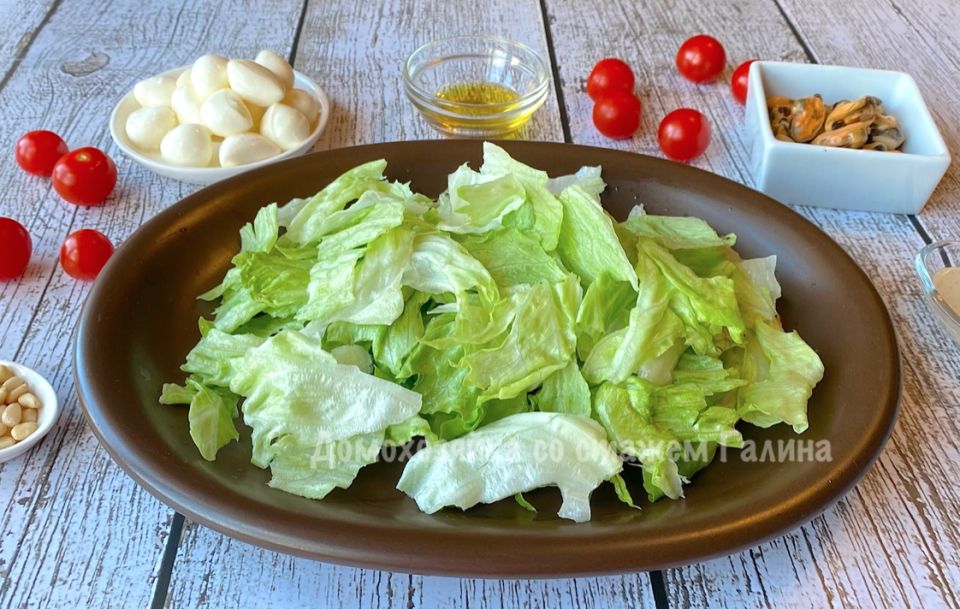 Сначала следует тщательно промыть и обсушить листья салата айсберг, а затем порвать их на произвольные кусочки и выложить в миску. Копченые мидии следует извлечь из масла, промыть под горячей водой и выложить на салат.