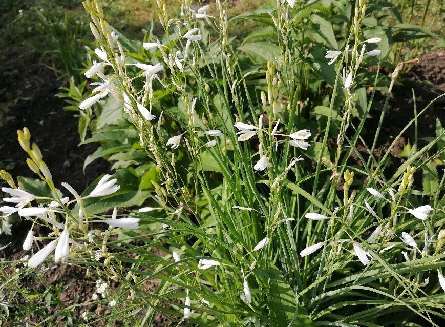Этот вид, известный также как лилия полевая или призаборная, чаще всего встречается в южной и западной частях России. Венечник ветвистый достигает 50 см в высоту и отличается злаковидными, слегка изогнутыми листьями, напоминающими ирис. Его белые ароматные цветы диаметром 2,5 см собраны в ажурные рыхловатые соцветия с тонкими розовыми жилками. Цветенье начинается в конце июня и может продолжаться до начала августа в течение полутора месяцев.