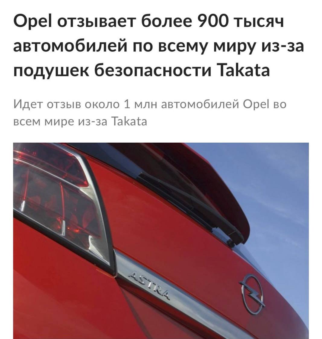 Opel отзывает почти миллион машин из-за «подушек-убийц» — речь о моделях Astra, Mokka, Zafira, Vectra, Cascada, Meriva и Signum с 2003 по 2018 год.