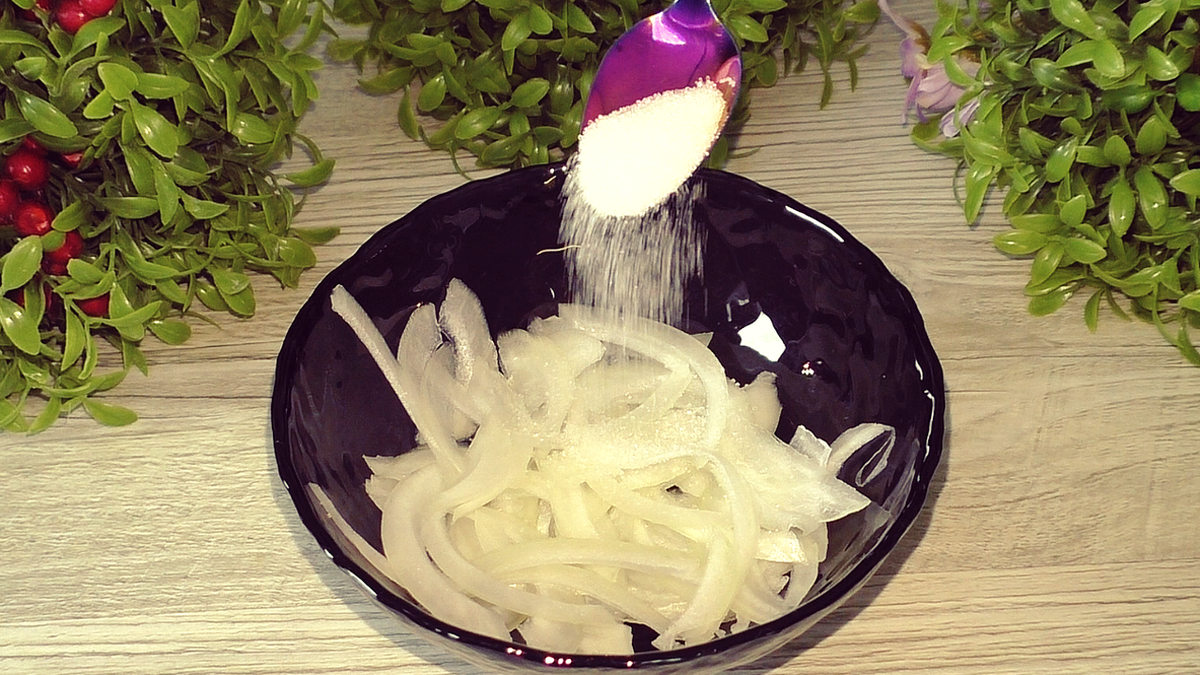 Сначала необходимо нарезать лук произвольно и добавить к нему щепотку соли и немного сахара, что сделает его менее острым и придаст сладковатый вкус. Для этого подойдет маленькая луковица, к которой можно добавить около 0.5 ч. л. сахара.