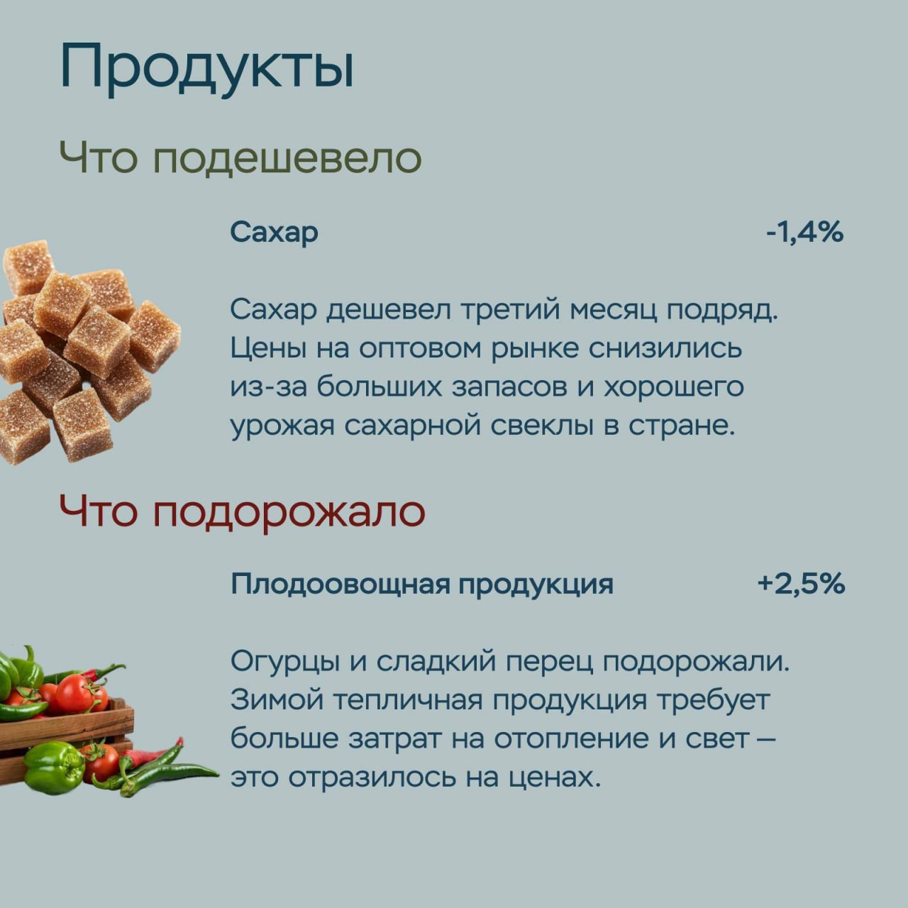Сахар дешевеет третий месяц подряд, а вот овощи и парфюмерия выросли в цене. Это связано с сезонностью и повышением НДС. Подробнее – в обзоре Отделения Банка России по ЧР.