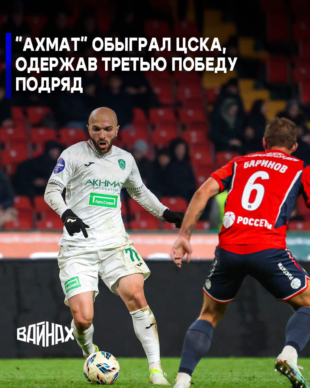 Футболисты грозненского "Ахмата" со счетом 1:0 обыграли московский ЦСКА в домашнем матче 19-го тура Мир - Российской премьер-лиги (РПЛ).