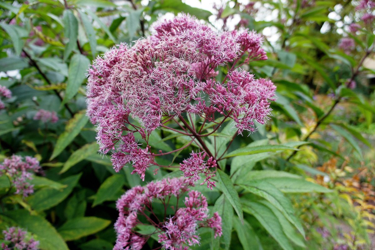 - Посконник: Это травянистое растение с бордовыми стеблями и нежными розовыми или белыми цветками. Посконник абсолютно не требователен в уходе: достаточно лишь срезать стебли осенью. Он также привлекает насекомых, становясь лакомством для пчел.