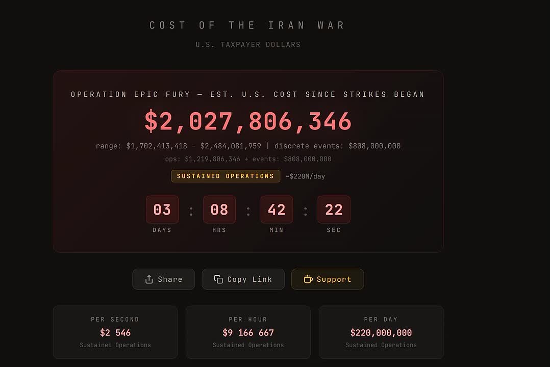 В сети появился сайт Cost of the Iran War, который в реальном времени подсчитывает, во сколько американским налогоплательщикам обходится операция против Ирана. Счетчик уже перевалил за $2 млрд долларов.