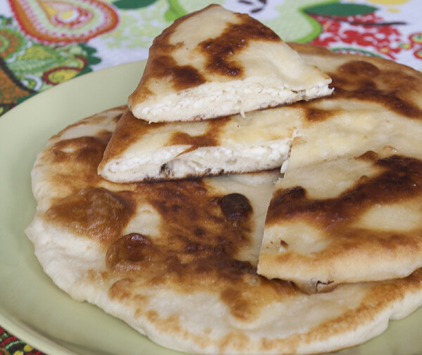 - В центр каждого круга равномерно распределите сыр, стараясь не засыпать края. Соберите края лепешки к центру, скрепите и переверните её, затем снова раскатайте.