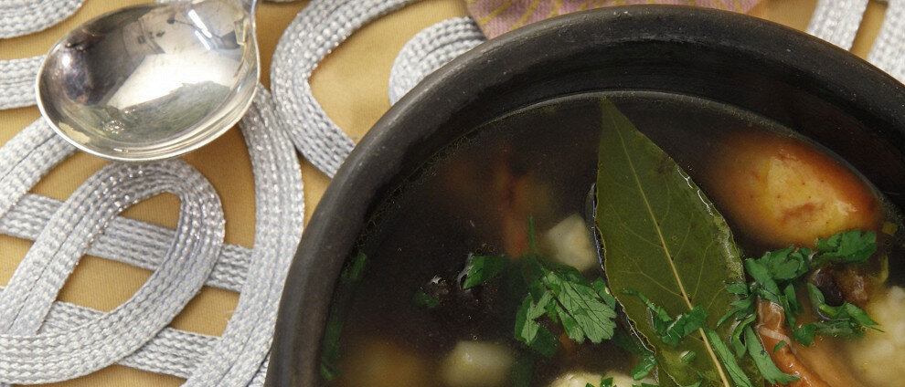 В большой кастрюле залить свиную рульку пятью литрами воды, довести до кипения, посолить и варить на невысоком огне около двух часов, не забывая снимать пену. Затем процедить бульон через марлю.Сухофрукты залить холодной водой для размягчения.Корень сельдерея и морковь нарезать кубиками размером около 1 см, а лук-порей – полукольцами. Обжарить овощи на растительном масле до золотистой корочки.Копченого угря освободить от костей и нарезать крупными кусками.В небольшом сотейнике довести молоко со сливочным маслом почти до кипения. Постепенно добавлять муку, взбивая венчиком, затем добавить яйца, соль, перец и мускатный орех.В процеженный бульон добавить обжаренные овощи, размоченные сухофрукты, зеленый горошек, куски угря, лавровый лист и душистый перец.Сформировать клецки из теста и добавить их в кипящий суп. Готовить еще около 20 минут и подавать, посыпав свежей рубленной петрушкой.Приглашаем попробовать этот уникальный суп, который подарит незабываемые ощущения и проверит на прочность любые гастрономические предпочтения. Приятного аппетита!