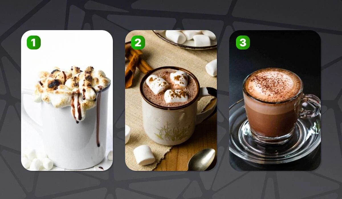 Выбрав первую кружку, вы демонстрируете дух искателя приключений. Для вас новизна – это стиль жизни, а рутина – это что-то, что вы стараетесь избегать. Ваши спонтанные решения и любовь к переменам делают каждый день уникальным. Вы охотно принимаете вызовы и с интересом относитесь к новым путешествиям и опыту.