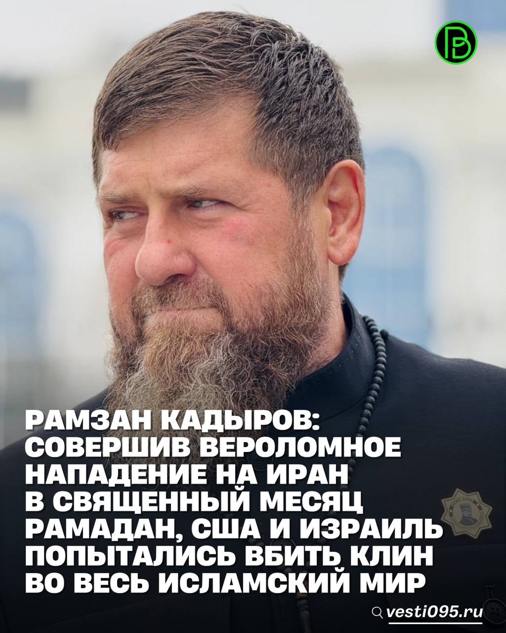 Глава ЧР Рамзан Кадыров в своём Телеграм-канале написал, что совершив вероломное нападение на Иран в священный месяц Рамадан, США и Израиль попытались вбить клин во весь исламский мир.