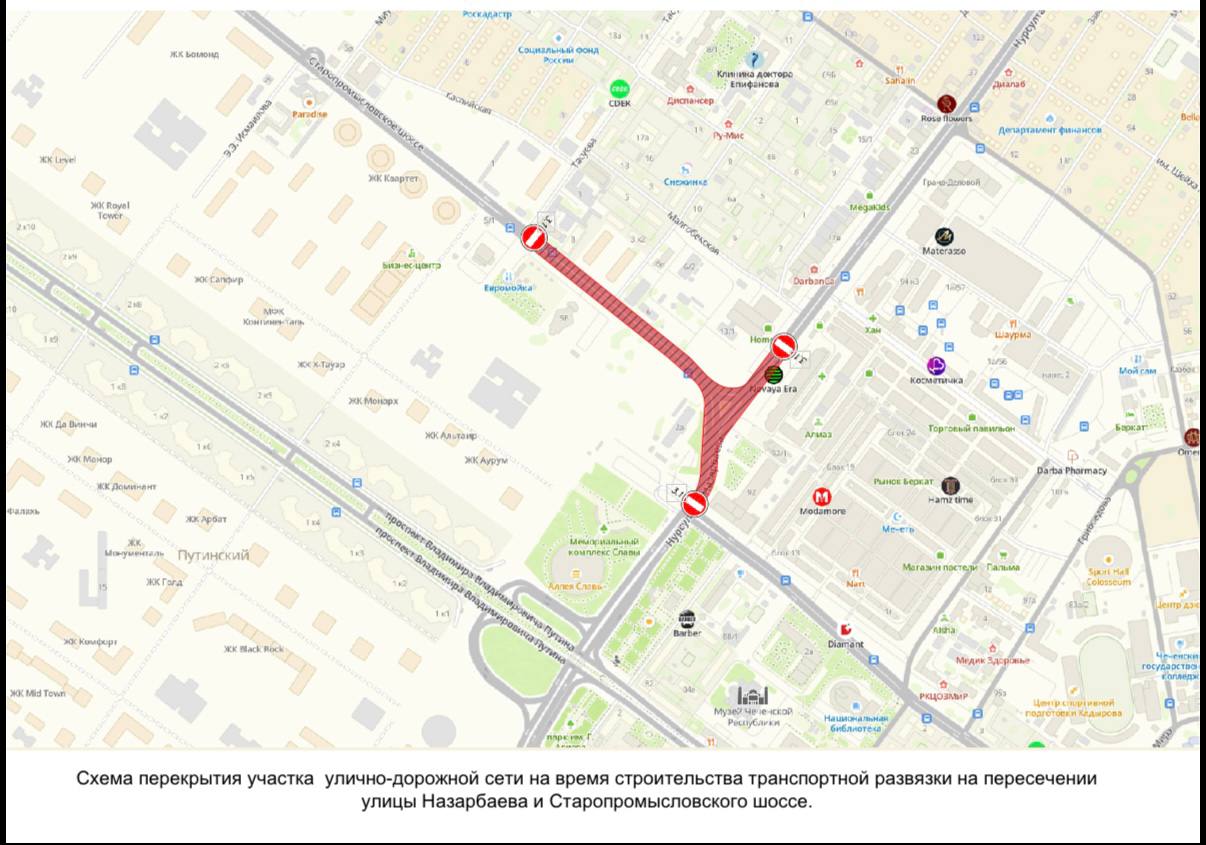 С 08:00 22 марта 2026 года вводятся дополнительные временные ограничения на участке пересечения улицы Назарбаева и Старопромысловского шоссе. Ранее закрытый отрезок Старопромысловского шоссе (от улицы Назарбаева до улицы Тасуева) остаётся недоступным для движения.