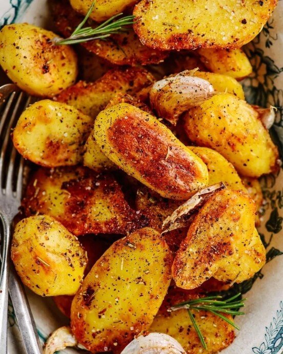 Разогрейте духовку до 190 °C и запекайте картофель в течение 45–60 минут, периодически помешивая. Картофель должен стать золотистым и хрустящим. В конце приготовления добавьте морскую соль по вкусу.
