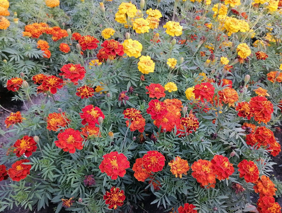 Бархатцы тонколистные (мексиканские): Невысокие кустики высотой 20–40 см с мелкими, перисто-рассечёнными листьями и соцветиями, собранными в щитки.