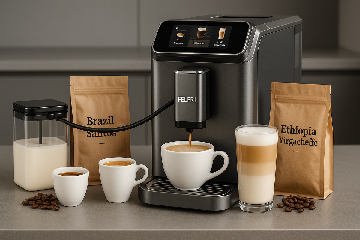 Автоматическая кофемашина FELFRI FCM-006 обладает мощностью 20 бар, предлагает 12 режимов и 3 уровня крепости. Особенно стоит отметить функционал предварительного смачивания, автокапучинатор на 0,75 л и вместительный резервуар для воды (1,5 л). Оснащенная Wi-Fi и сенсорным управлением, модель гарантирует бесперебойную экстракцию, что является основой для получения сладкого вкуса без добавления сахара.