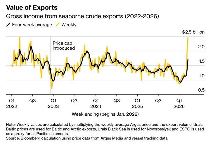 Резкий рост цен на российскую нефть экспортных сортов и объемов поставок привел к значительному скачку недельных доходов России, подняв их до самого высокого уровня с марта 2022 года, сообщает Bloomberg.