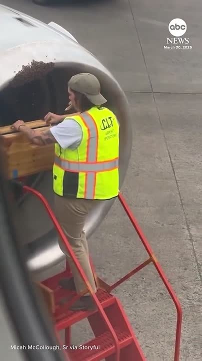 В Шарлотте, Северная Каролина, США, пассажиры стали свидетелями того, как с их самолета перед взлетом убирали пчелиный улей.