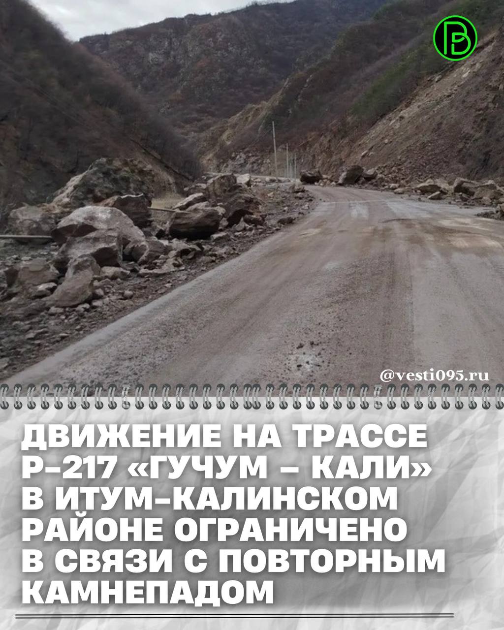 Администрация Итум-Калинского муниципального района информирует всех жителей и гостей района: на трассе Р-217 «Гучум – Кали» в Итум-Калинском районе произошёл повторный камнепад. Участок дороги временно затруднён для проезда, движение ограничено с целью обеспечения вашей безопасности.