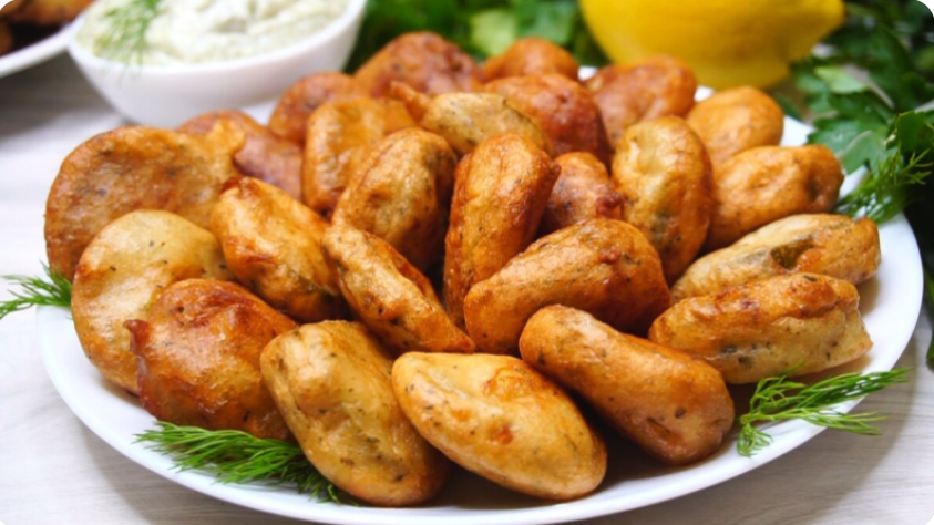 Эта закуска точно удивит ваших гостей и близких. А сочетание хрустящего кляра с кислинкой огурцов и насыщенным чесночным соусом заставит вернуться за добавкой!