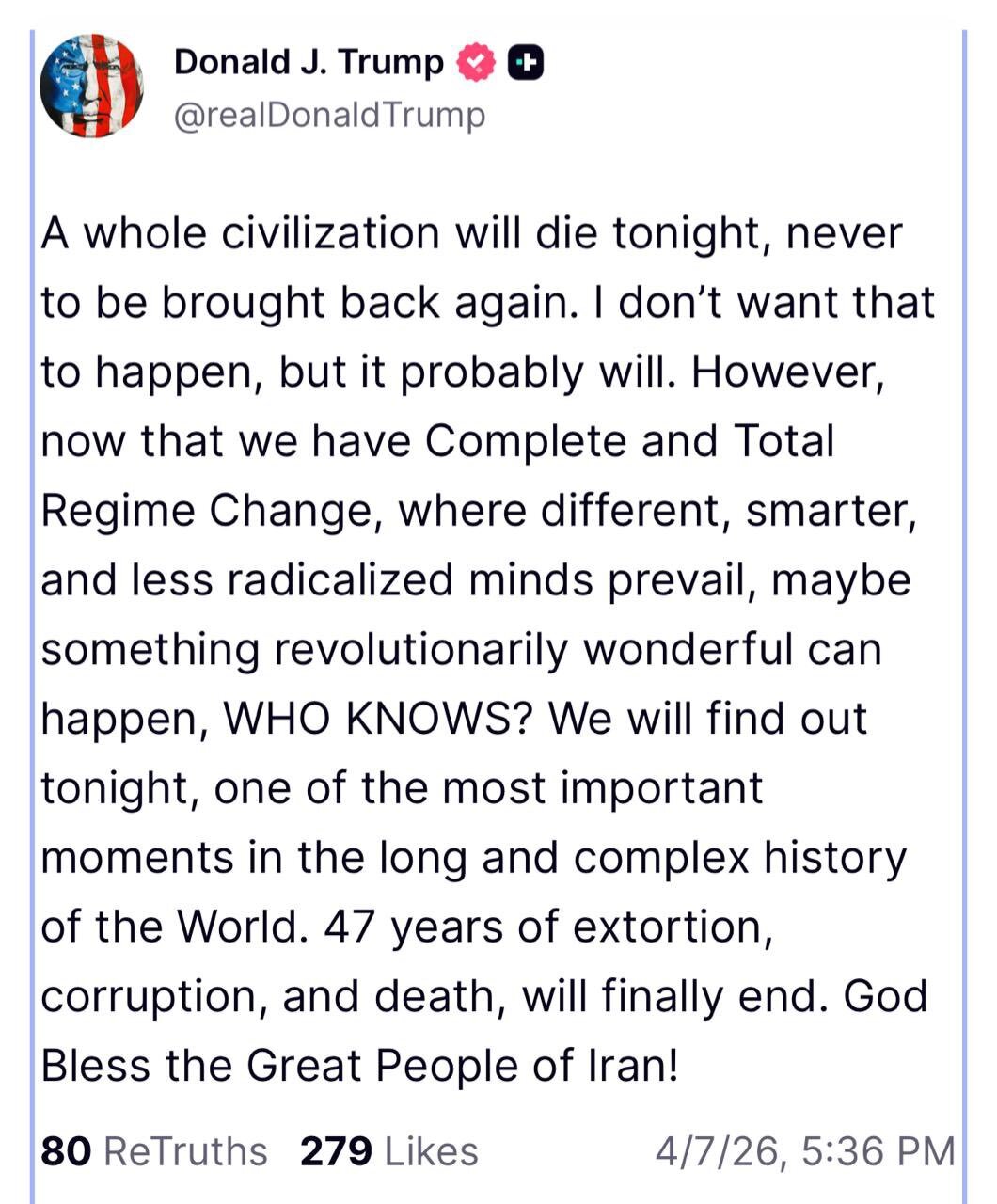 Целая цивилизация погибнет сегодня, ее не получится возродить, написал Трамп в соцсети Truth Social.