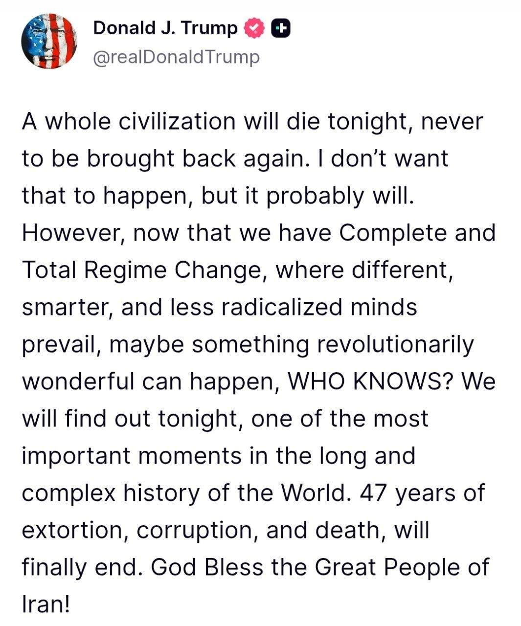 «Мы узнаем это сегодня ночью — в один из самых важных моментов в истории мира», — написал он, добавив, что «47 лет вымогательства, коррупции и смерти наконец-то закончатся».