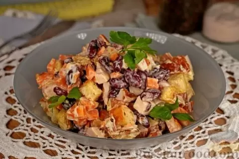 Этот салат – идеальный выбор для тех, кто ценит сытные и вкусные блюда. Основные ингредиенты: копченая курица и консервированная фасоль, которые в сочетании с майонезом образуют невероятный тандем. Подавайте его с хрустящими сухариками, приготовленными из белого хлеба, и наслаждайтесь каждым кусочком.
