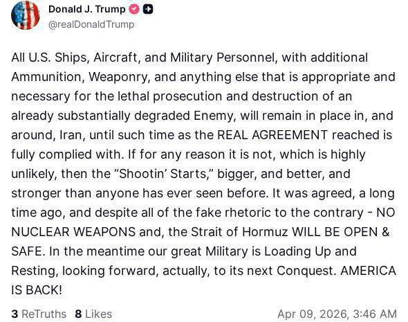 Все корабли, самолеты и военнослужащие США останутся на своих местах "на территории Ирана и рядом с ним" до тех пор, пока не будет выполнено достигнутое соглашение, объявил Трамп.