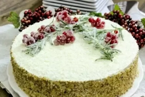 Украсить торт можно измельченными грецкими орехами, веточками розмарина и клюквой, предварительно обваляв их в сахарной пудре.