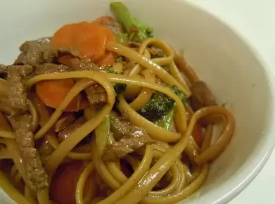 Верните говядину к овощам, залейте соусом и тушите 2-3 минуты, пока соус не загустеет. Лапшу отварите до состояния «аль денте» и добавьте к мясу и овощам. Перемешайте и прогрейте еще 1-2 минуты.