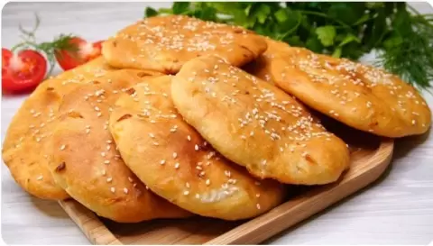 Раскатать каждый колобок в лепешку диаметром 10–12 см и выложить на противень, посыпав кунжутом. Оставить на расстойку на 10–15 минут, затем выпекать в разогретой до 180°C духовке около 15 минут.