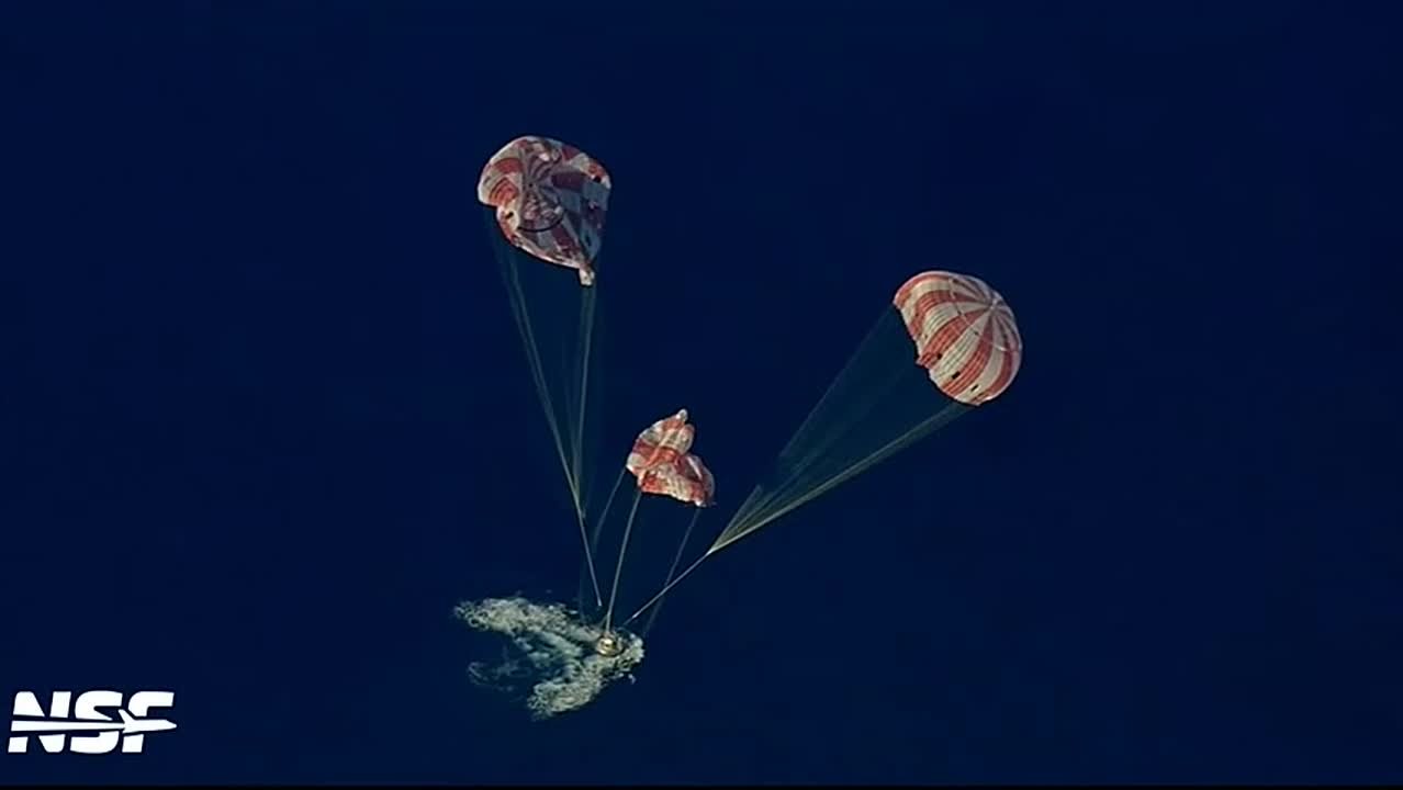 На видео экипаж миссии "Артемида II" входит в атмосферу Земли и приводнение в Тихом океане.