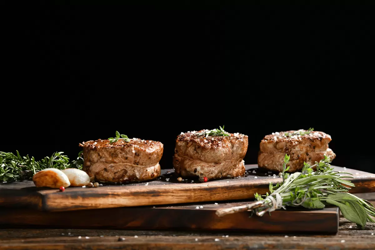 Чтобы начать, очистите говяжью вырезку от пленок и жира. Нарежьте мясо на порции толщиной около 3-4 см и слегка отбейте для равномерности прожарки.