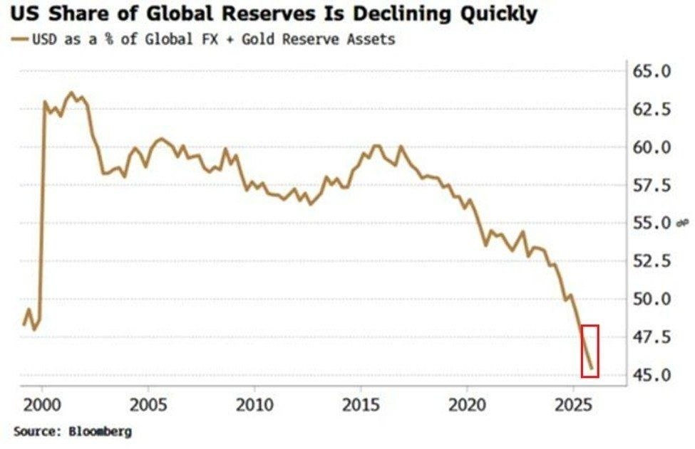 Доллар США в настоящее время составляет около 46% мировых валютных и золотых резервов, что является самым низким показателем по крайней мере за последние 26 лет, при этом этот процент снизился на 15 пунктов с 2017 года