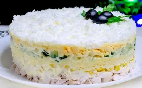 Постепенная сборка превращает обычный набор продуктов в гармоничный ансамбль. Курица, кукуруза, сыр и огурец выстраиваются в слои, а белки яиц образуют пушистый завершающий снежный слой, который сохраняет форму без лишнего майонеза.