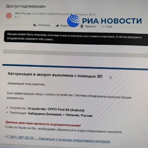 В письме аферисты говорят, что был зафиксирован вход с нового устройства, и система обнаружила "выгрузку документов" человека.