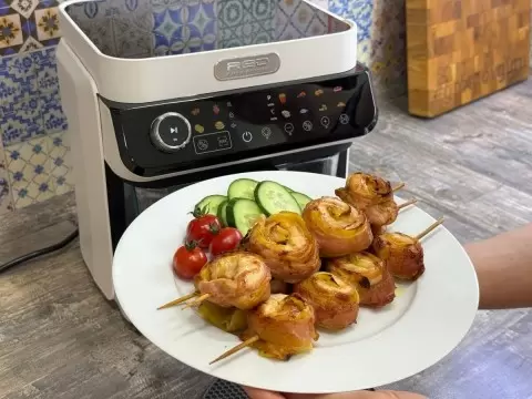 Аэрогриль предварительно разогревается, после чего шашлычки выкладываются и готовятся в режиме «Куриные голени» при температуре 190 °C около 20 минут. Бекон станет румяным, курица пропечётся, а картофель останется мягким.