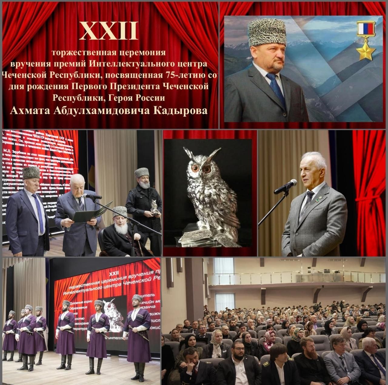 Состоялась XXII торжественная церемония вручения премий Интеллектуального Центра Чеченской Республики. Каждый предыдущий праздник интеллектуалов являлся существенным событием в жизни людей, занятых умственным трудом. Но особым смысловым наполнением отмечено очередное торжество. Оно, как охарактеризовал его принявший в нем участие лауреат премии Интеллектуального Центра ЧР, председатель Совета алимов СКФО, известный богослов Хож-Ахмед Жабраилович Кадыров, имело символическое значение, ибо было посвящено юбилею выдающегося сына чеченского народа Ахмата Абдулхамидовича Кадырова и утверждению богоданных ценностей, то есть разума и добра.