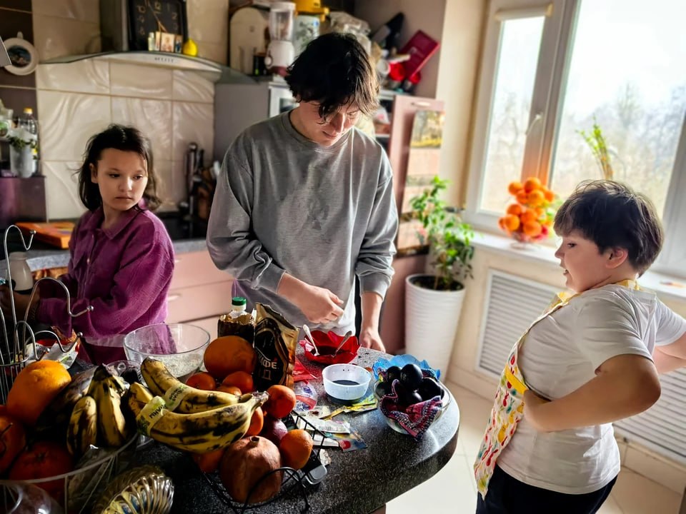 Домой она вернулась в полночь без шали и огурцов. А вскоре они с мужем уже ждали первенца. Сейчас эту семью сложно застать вместе: кто на учебе, кто на работе, кто в армии, а кто-то на СВО. Суета вокруг царит невообразимая: сами дети, заливающийся фальцетом йорк Ричи, две кошки-подобрашки Дина и Кэса и рыбки. Как же они умещаются в своей квартире?