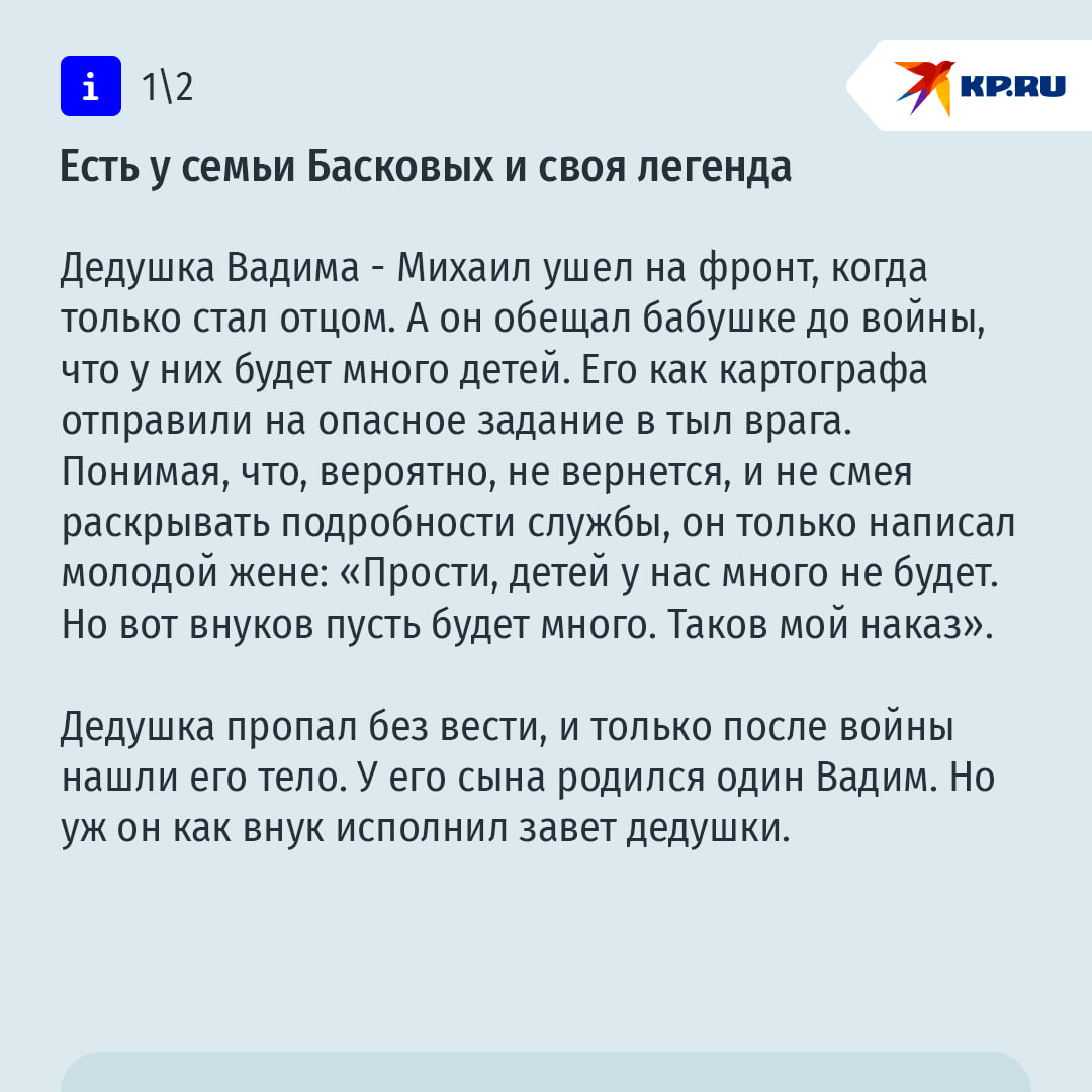 На сегодня в семье Басковых 12 детей. Но в самом начале супружеской жизни Лена и Вадим даже переживали, что Боженька не дает им ребятишек. Однажды в новогоднюю ночь муж делал салат, и выяснилось, что не хватает огурцов. До полуночи оставалось минут 40, и Лена, накинув шаль, помчалась в магазин. И вдруг на пути увидела лежащего мужчину. Одет прилично, но и выпил тоже прилично. А теперь спит и рискует замерзнуть. Лена сорвала с себя шаль, обмотала ему голову, начала тормошить. Нашли у мужчины в кармане телефон и дозвонились заплаканной жене. Она уже не знала, где искать свое сокровище.