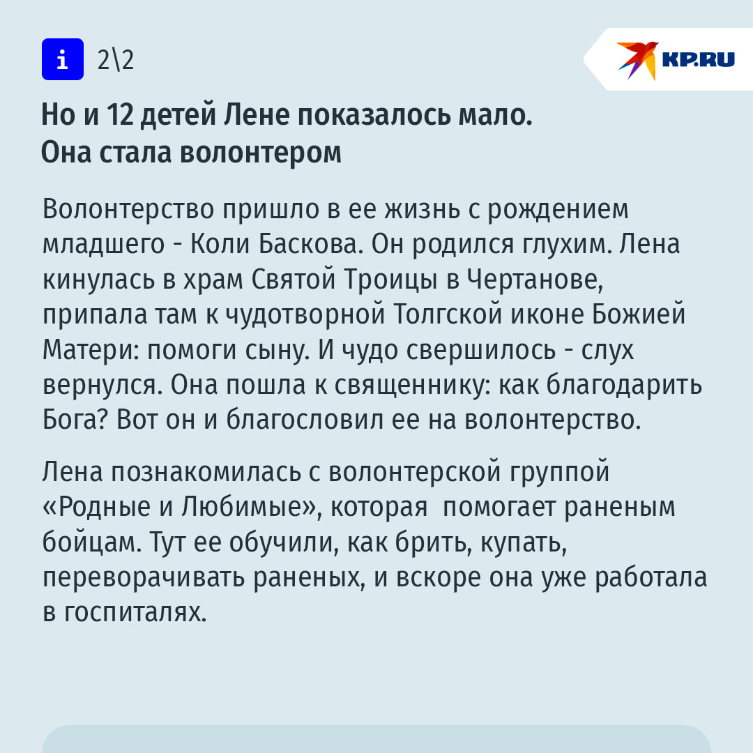 Вот только звания "Мать-героиня" у Лены нет. Она не в претензии - мало ли достойных на Руси. Зато у нее есть орден от Патриарха "За достойное воспитание детей".