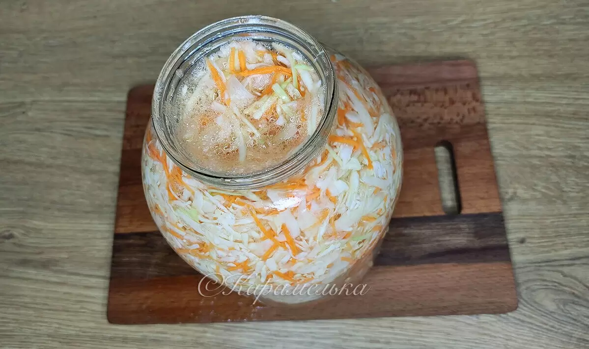После трех дней сливают старый рассол и заливают свежей водой, добавляя 2 ст. л. сахара и 1 ст. л. соли. Оставляют на сутки в холодильнике, после чего капуста становится готовой к употреблению. Она получается хрустящей и с гармоничной кислинкой, которая идеально дополняет любые блюда.