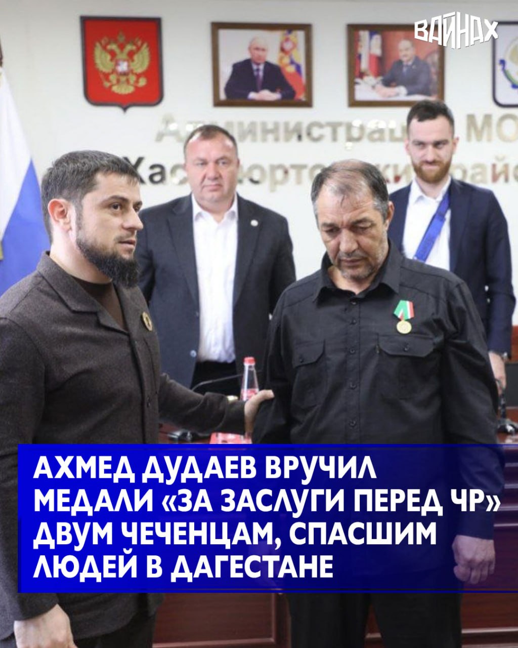 Заместитель Председателя Правительства Чеченской Республики – министр ЧР по национальной политике, внешним связям, печати и информации Ахмед Дудаев по поручению Главы Чеченской Республики Рамзана Ахматовича Кадырова вручил медали «За заслуги перед ЧР» жителям Чеченской Республики Саламбеку Абдулбариеву и Висхану Закаеву, оказавшим помощь дагестанцам на затопленных территориях во время разгула стихии.