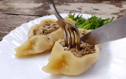 Затем тесто раскатывается в тонкий пласт и нарезается на квадраты. В центр каждого квадрата помещается начинка, после чего края защипываются, образуя лодочки. Подготовленные изделия выкладываются на сковороду с разогретым растительным маслом.